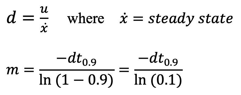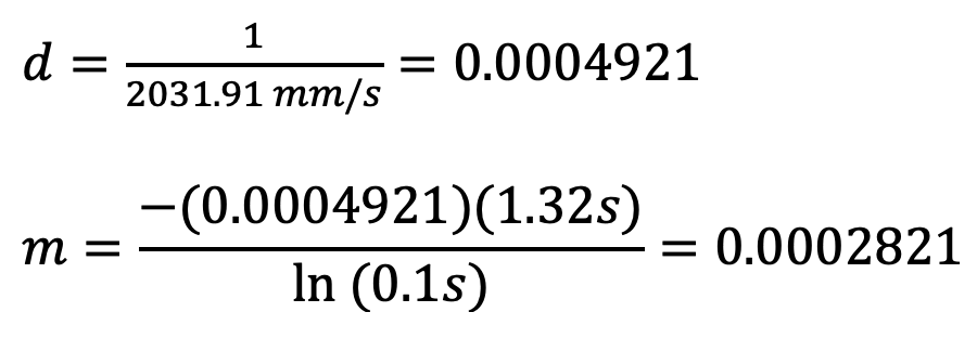 From the above graph it can be seen that the steady state velocity is just over -2000mm/s, or more specifically -2031.91mm/s. Using a 90% rise time a line on the above graph was plotted showing 90% of the settling value. This value is (-2031.91mm/s * 0.9) = -1828.72mm/s. The 90% rise time can be determined from the graph as 1.32s. The steady state velocity is used to find the drag. The drag and rise time are used to find the momentum. The calculations to find drag (d) and momentum (m) are found below: