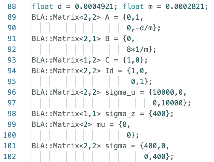 After creating the cases for the Kalman Filter, I then started working on writing a Kalman Filter function in Arduino IDE. The final initialization of the matrices is below: