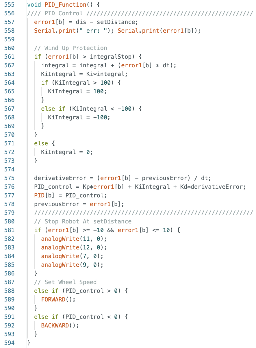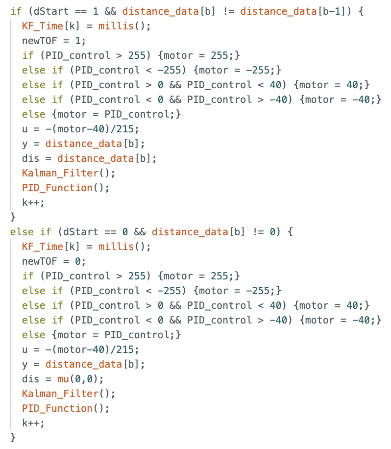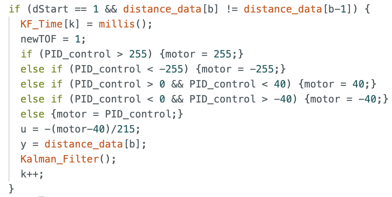 I started the next step by removing the PID control from the larger while loop and creating a separate function called PID_Function(). A separate function for PID control allowed for me to more easily switch the order to performing the Kalman Filter before the PID controller. Previously the PID controller used the ToF sensor measurements every time the loop ran. In the new iteration of the code, if the update step of the filter runs, the distance measurement used will be the ToF sensor reading. If the prediction step runs the most current value of mu will be used in the PID controller. The if and else statements for the update and prediction steps are shown below. The variable dis is the distance measurement used in the PID controller. The u value for the Kalman Filter was calculated the same as in Jupyter Notebook using the PID control values.