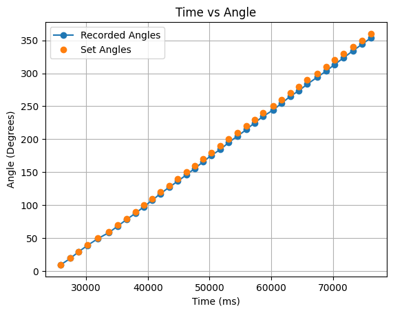The next step involved using the proportional controller (with Kp = 2) and the integral controller to increase the speed of rotation and to achieve a small amount of oscillation at the desired angle. The integral controller is the constant Ki multiplied by integrated error over time. As time increases the integrated error increases, resulting in a greater contribution of the integral controller. To prevent the integral controller component from increasing continuously, wind up protection was implemented. If the value of Ki mulitplied by the time integrated error is greater than 200 or less then -200, then the KiIntegral is set to be 200 or -200 and does not further increase/decrease. The code for the proportional and integral controller is below.