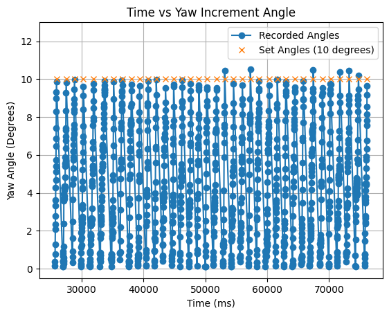 I plotted the values of yaw for each 10 degree increment. As can be seen in the below graph the PID controller works as expected. After yaw increases to 10 degrees, the value of yaw is reset to zero and then again increases to 10 degrees for the next increment. The slight variation in the final yaw value is due to the -0.5 to 0.5 degree tolerance.