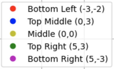 The robot was placed at each of the following points: (-3,-2), (0,0), (0,3), (5,3), and (5,-3). The image below shows each of the points in the lab.