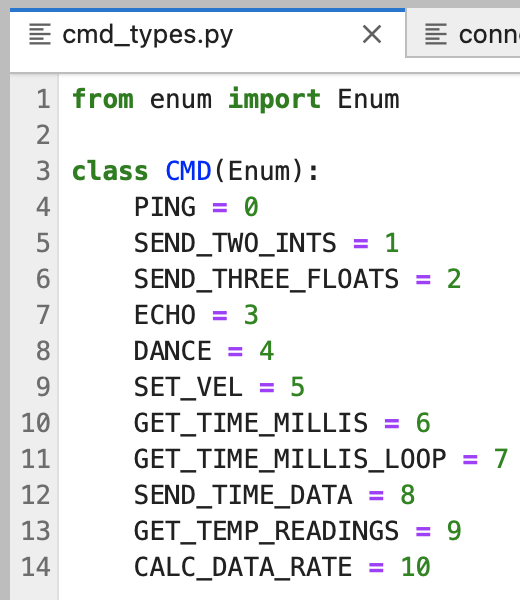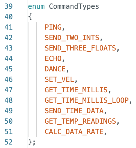 Several command types needed to be defined to complete the tasks outlined in the next section. Added commands include ECHO, GET_TIME_MILLIS, GET_TIME_MILLIS_LOOP, SEND_TIME_DATA, and GET_TEMP_READINGS.