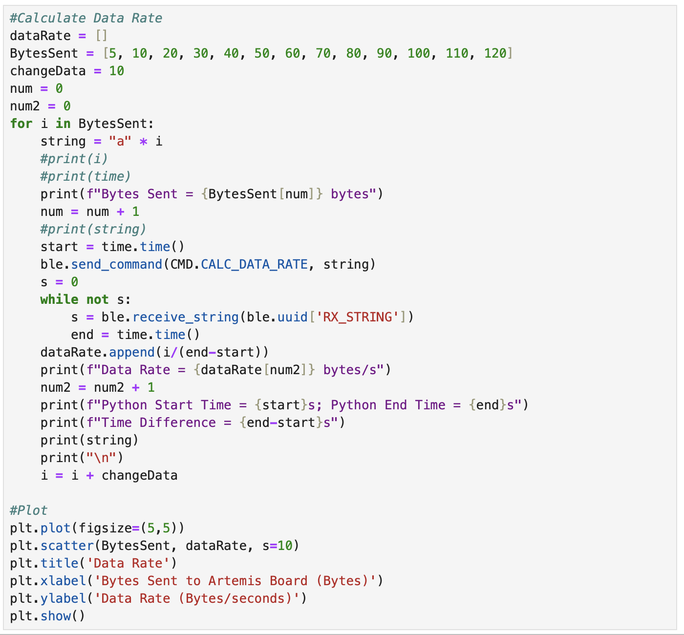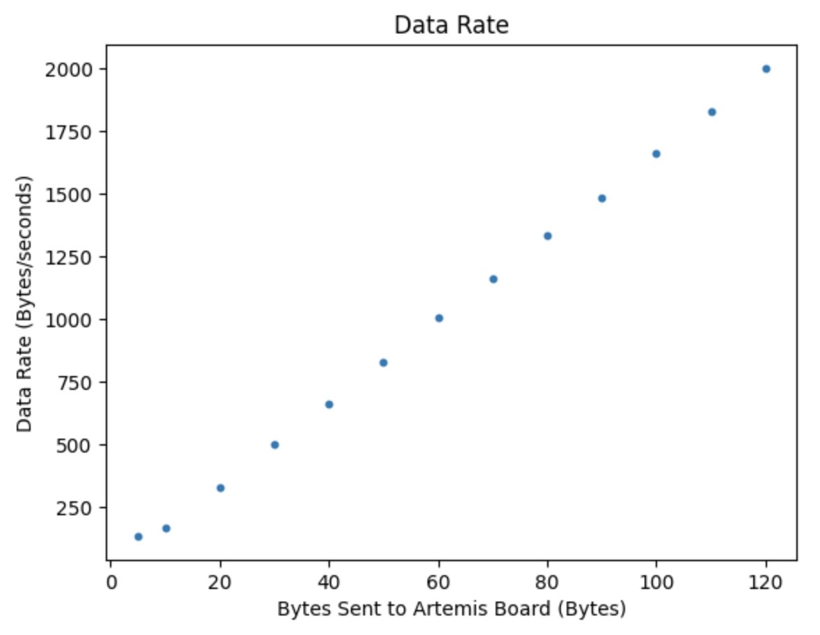 I sent a message from the computer and received a reply from the Artemis board. The data rate for 5, 10, 20, 30, 40, 50, 60, 70, 80, 90, 100, 110, and 120 bytes was tested. The data rate for 5 bytes is 132.722 bytes/s and the data rate for 120 bytes is 2003.210 bytes/s. The plotted graph shows that as the number of bytes sent to the Artemis board increases, the data rate increases. Below are pictures of the Jupyter Notebook code, the graph, and the printed statements.