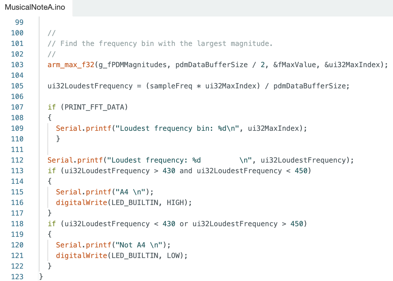 The Artemis board was programmed to turn on the LED when the musical note A4 is played on a speaker (code below). I started with the Example01_MicrophoneOutput sketch, and I added if statements (lines 113-122 below). The note A4 is 440Hz (UC Berkeley Reference). The first if statement determines if the frequency is between 430Hz and 450Hz to account for any slight error in sound quality. If the frequency is within range an “A4” statement will be displayed in the Serial Monitor and the LED on the Artemis board will turn on. The second if statement determines if the frequency is lower than 430Hz or greater than 450Hz. If the frequency is lower than 430Hz or greater than 450Hz a “Not A4” statement will be displayed in the Serial Monitor and the LED on the Artemis board will turn off.