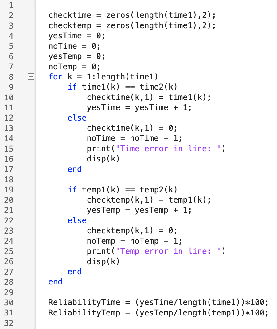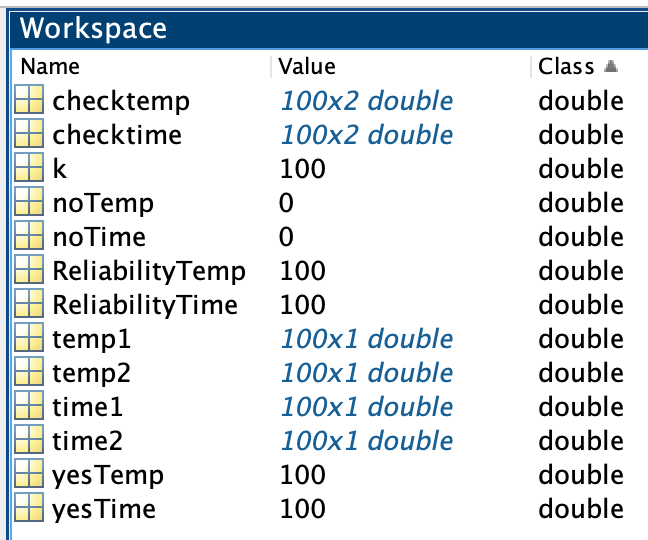 After looking at the outputs, the time and temperature readings on the computer are the same as the Artemis board and no data is missed. To confirm I copied and pasted the data from each window into Matlab variables titled time1 and temp1 for the Jupyter Notebook data, and time2 and temp2 for the Artemis data. I wrote a script to compare the corresponding time and temperature data and record how many data points are the same and how many are different. If there is a data point in the Jupyter Notebook that does not correspond to the Artemis board, or vice versa, an error message is displayed. The output variables in the workspace show that all data points are the same. The reliability is 100%.
