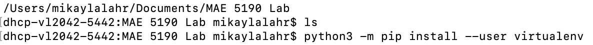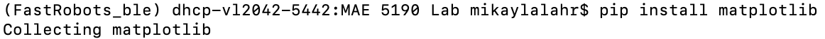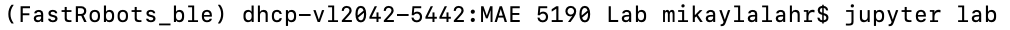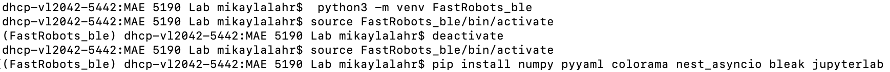 During the setup for the lab I already had installed Python 3. I needed to install pip by running the line "python3 -m pip install --user virtualenv" in the Command Line Interface (CLI). I created a folder called “MAE 5190 Lab” where I put all of the Jupyter Notebook files. I then created a virtual environment by typing "python3 -m venv FastRobots_ble" in the CLI.