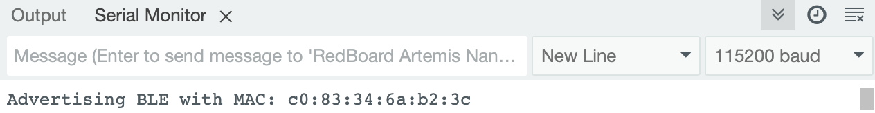 After uploading the provided ble_ardunio.ino file to the Artemis board the MAC address was printed in the serial monitor. The MAC address is c0:83:34:6a:b2:3c The image below shows the Arduino serial monitor with the printed MAC address.