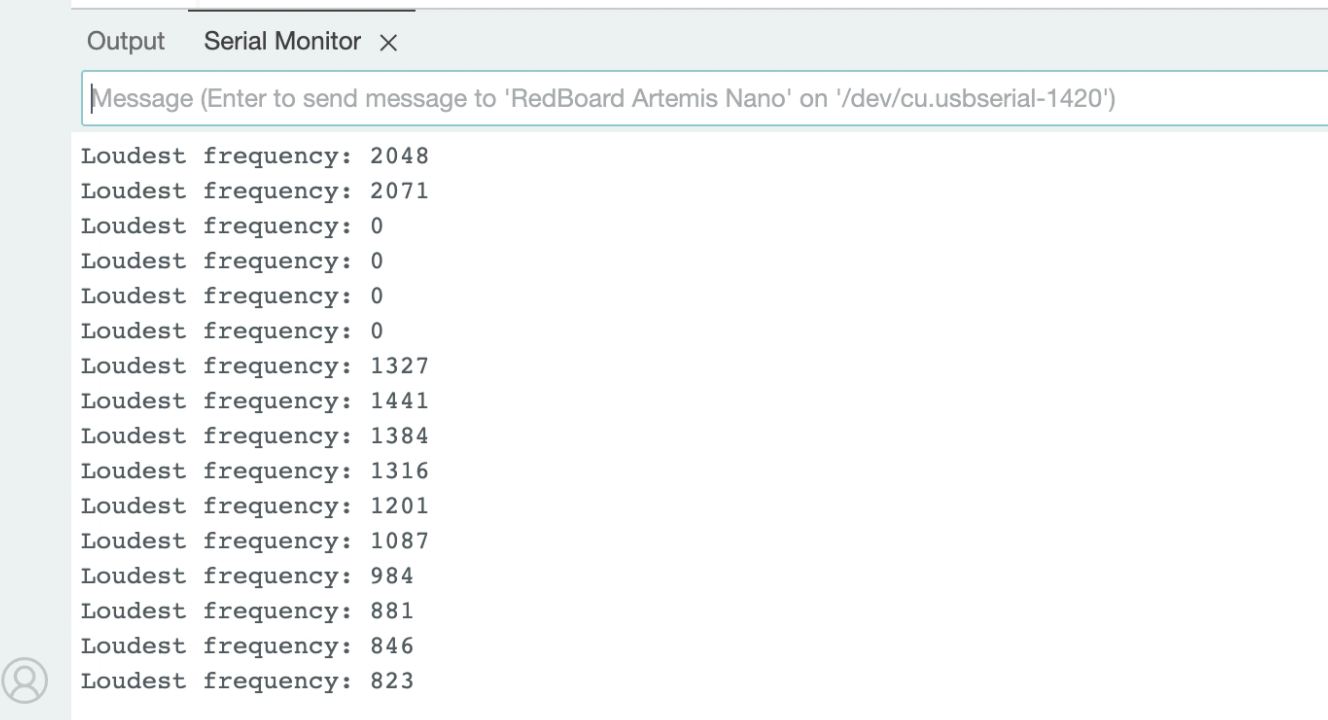 The Microphone Output task tests the microphone of the Artemis board. Example code: File->Examples->PDM->Example1_MicrophoneOutput. During this task I spoke into the microphone to change the frequency (image and video shown below).