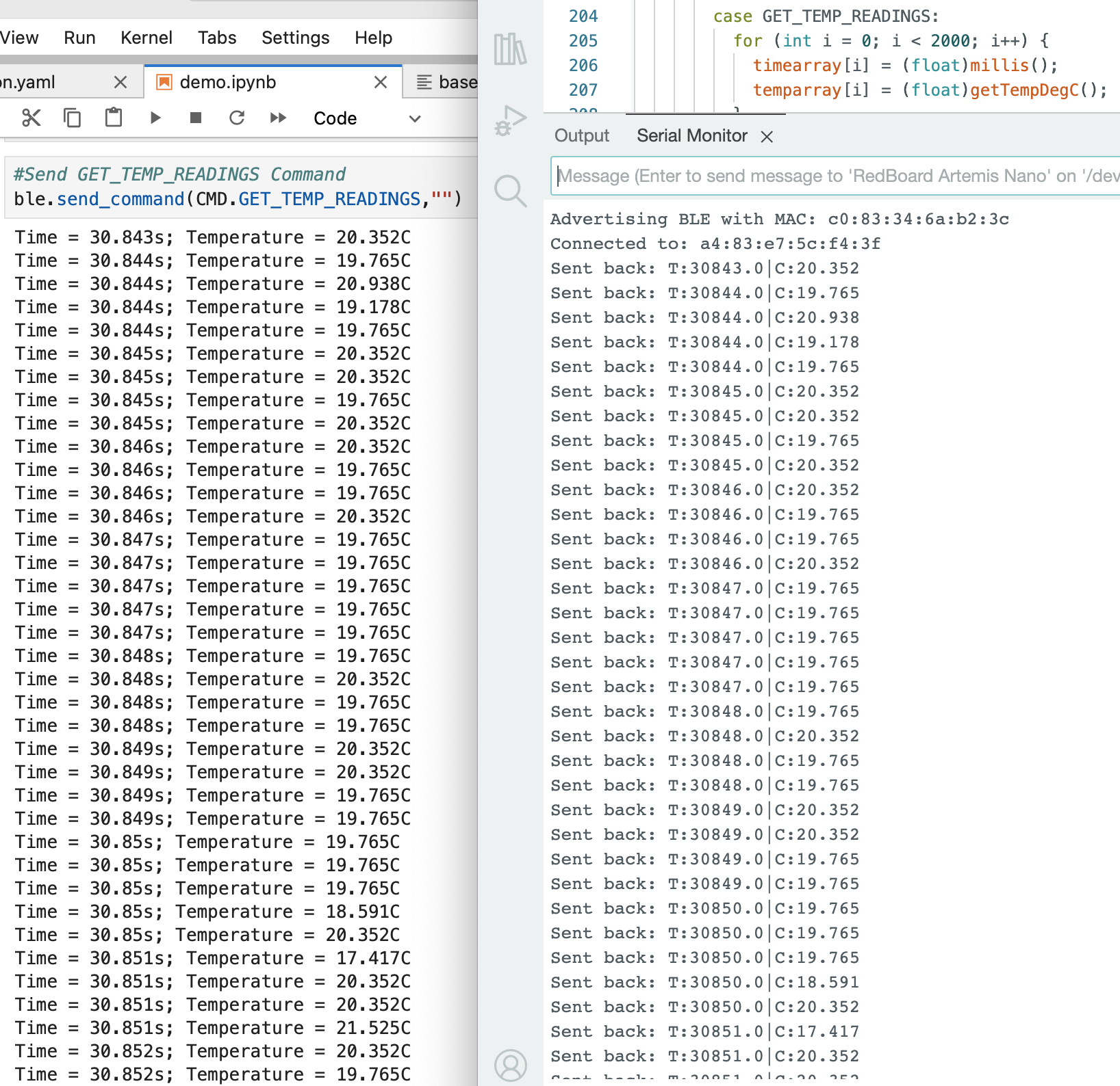 A second array was added to store temperature readings from the Artemis board. The temperature array is the same size as the time array. The time and temperature readings were taken at the same time. The data is sent as an array to the computer using Jupyter Notebook.