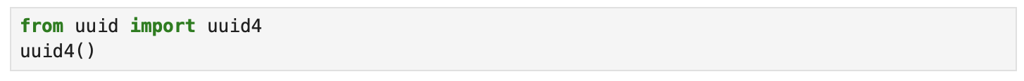 To set up Bluetooth communication, the MAC address needed to be changed in the Jupyter Notebook connection.yaml file to match the advertised MAC address from the Artemis board. Then unique UUID addresses needed to be used in the connection.yaml file and Arduino IDE because some devices in the lab may have the same MAC address. Using UUIDs ensures that the computer is receiving data from the correct Artemis board. The UUIDs were generated in the Jupyter Notebook demo.ipynb file and then entered into the connection.yaml and ble_arduino.ino files. Below is a picture of the lines of code used in the demo.ipynb file to generate the UUIDs.
